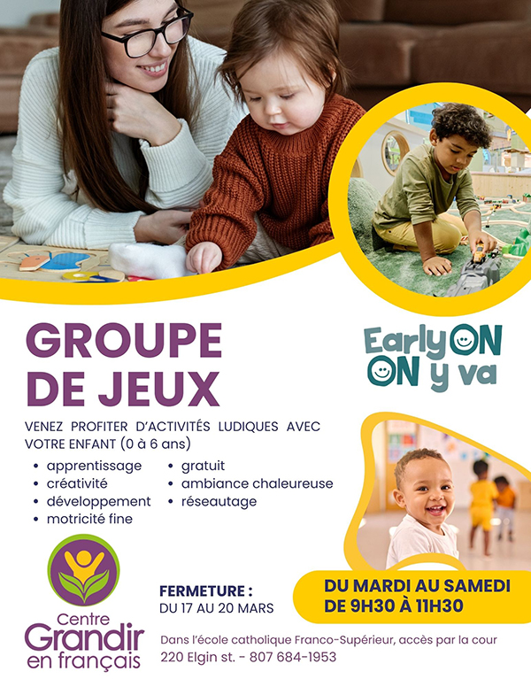 28mars 28, 2026●(1 évènement) – Le Centre grandir en français propose désormais un groupe de jeux le samedi matin de 9 h 30 à 11 h 30 pour les enfants (0 à 6 ans). Il est ouvert à tous et gratuit! Vous pouvez convier d'autres parents ou connaissances à y participer, pas besoin d'être inscrit à la garderie ou à Franco-Supérieur. Profitez de ce temps d'activités ludiques offert par les éducatrices! Ce service de la communauté offre une autre occasion à votre enfant de développer ses apprentissages et d'être dans un environnement francophone.